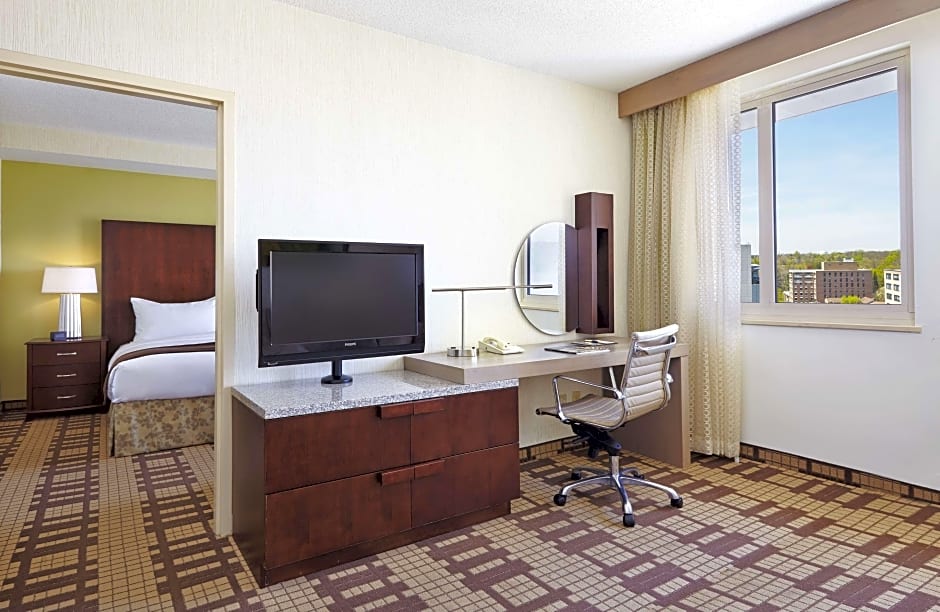 This mobility and hearing accessible room features one full sized bed and an accessible tub. The room also has a visual alarm, and notification devices for the doorbell or door knock and incoming telephone calls.